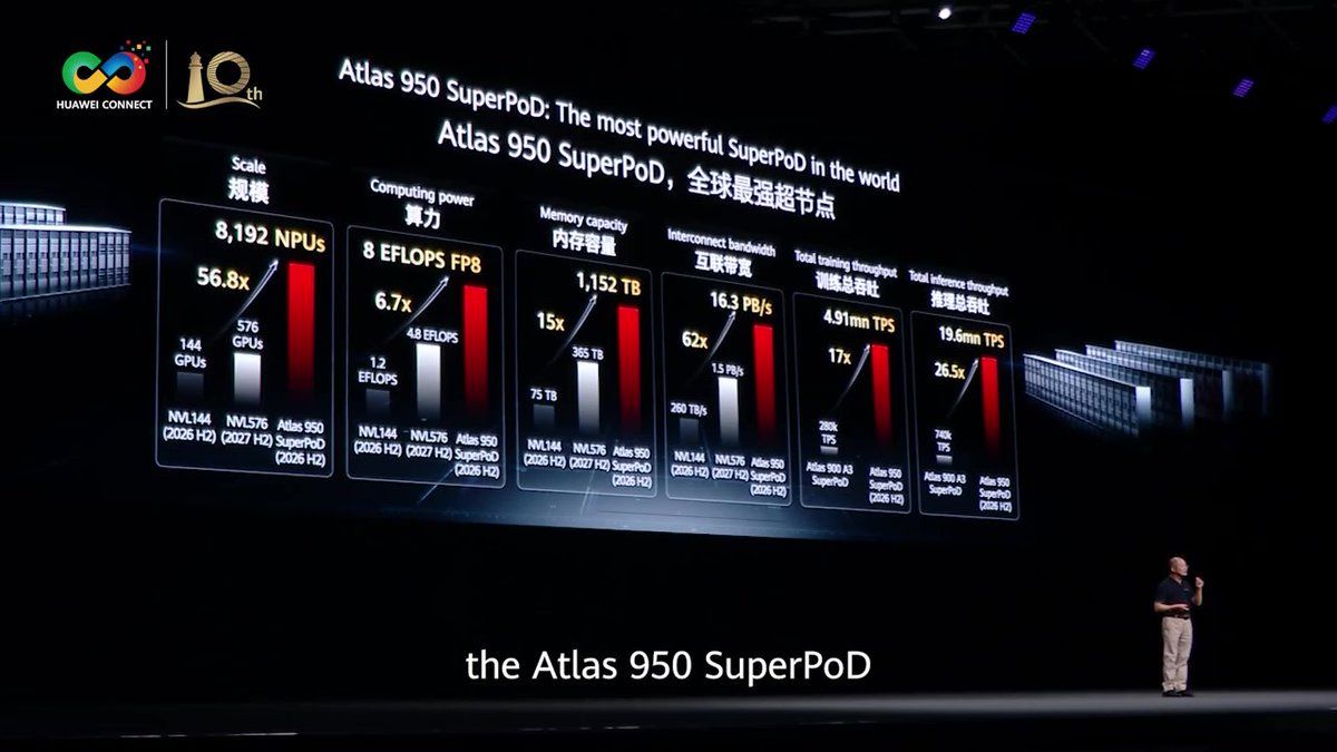 En el terreno de producto, Huawei ha anunciado el Atlas 950 SuperPoD para el cuarto trimestre de 2026 con soporte para más de 8.000 NPUs Ascend, 128 racks de cómputo y unos 1.000 m² de superficie. El sistema alcanzará 6,7 veces más potencia de cómputo y 15 veces más capacidad de memoria que la generación previa, hasta 1.152 TB, en palabras de Xu.
