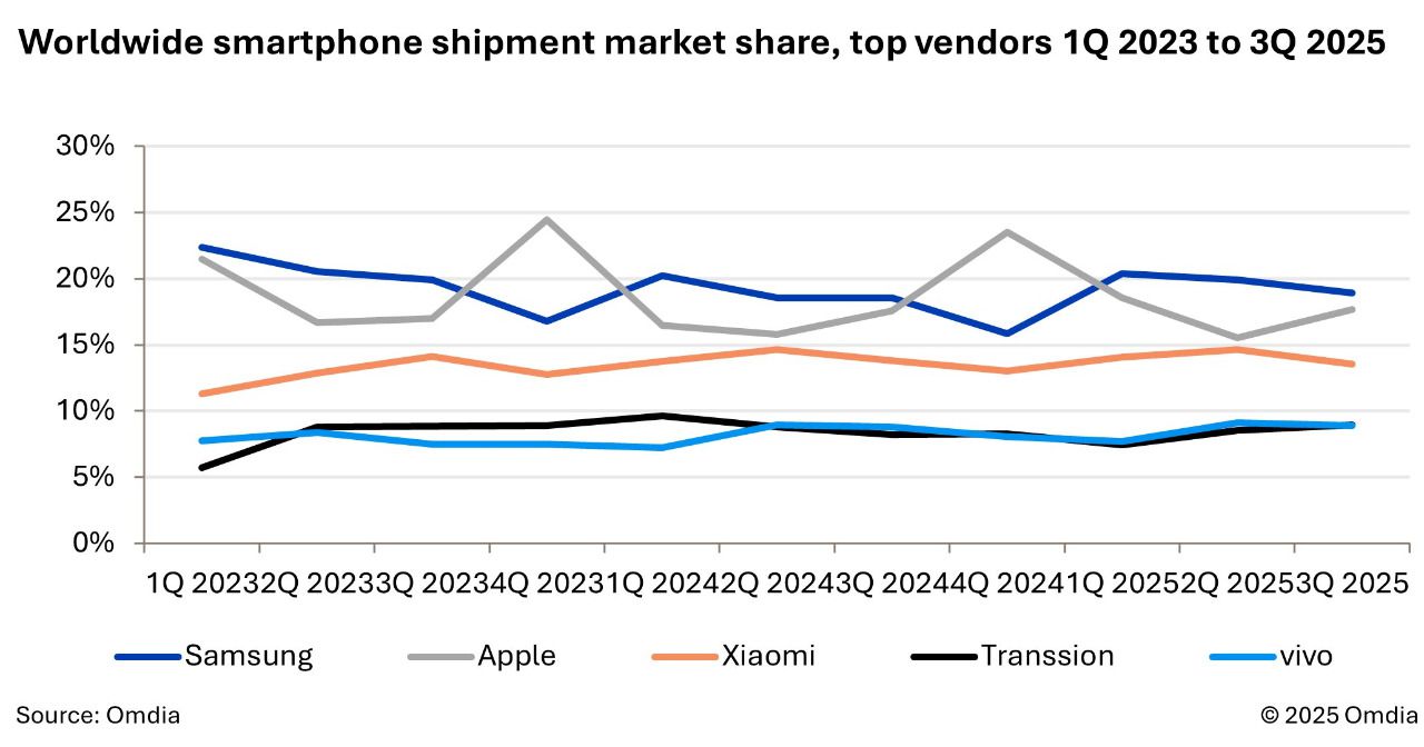 Apple, por su lado, mantiene la segunda posición mundial con 56,5 millones de unidades, lo que representa un aumento del 4%. La buena acogida del iPhone 17 base, con mayor capacidad de almacenamiento sin subida de precio, y la sólida demanda de las versiones Pro y Pro Max explican su rendimiento. Omdia apunta, además, a un crecimiento sostenido de la compañía en mercados emergentes como India, que seguirá impulsando sus resultados anuales.