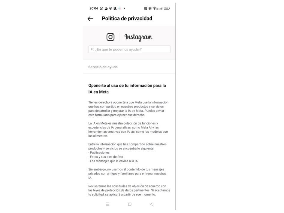 Meta ha proporcionado un formulario de objeción para que cualquier usuario ejerza sus derechos y se oponga al uso de su información para la IA. Para empezar, desde Instagram, las personas tendrán que ir a su perfil y hacer click en las tres líneas de la esquina superior derecha. Después, tendrán que hacer clic en Información y Política de Privacidad.