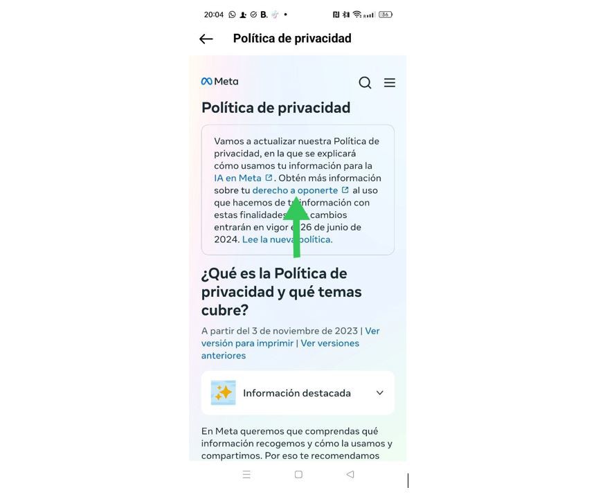 Una vez realizados los primeros pasos, verán la información de cómo tratan su información desde Meta. Ahí podrán pulsar en «derecho a oponerte»para iniciar el proceso.