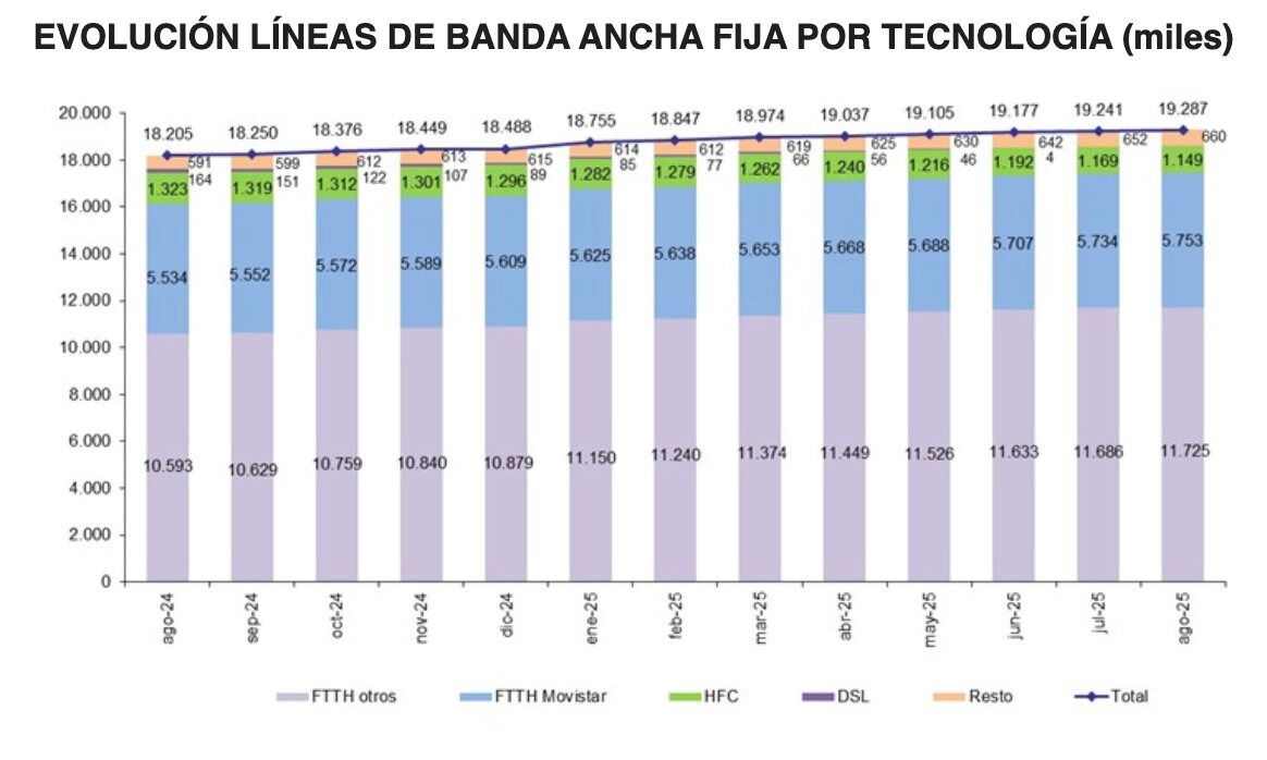 El mercado de la banda ancha fija siguió impulsado por el avance de la fibra óptica hasta el hogar. En agosto, la FTTH sumó 58.158 nuevas líneas, alcanzando un total de 17,5 millones. En conjunto, el parque nacional de líneas de banda ancha fija creció en 46.000 conexiones, hasta situarse en 19,3 millones.