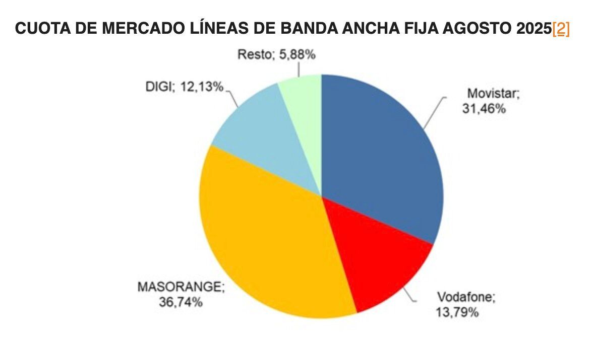 Movistar continúa liderando el mercado con 5,8 millones de líneas FTTH, lo que representa el 32,9% del total. El conjunto formado por Movistar, Vodafone y MasOrange concentra el 82% de las líneas de banda ancha fija, y al sumar a Digi, la cuota conjunta asciende al 94,1%.